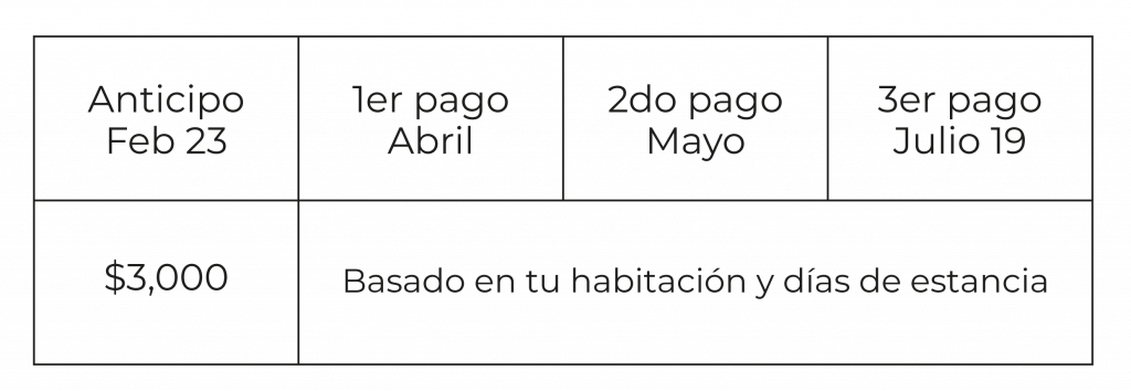 Tabla de precios / Costo por habitación por noche